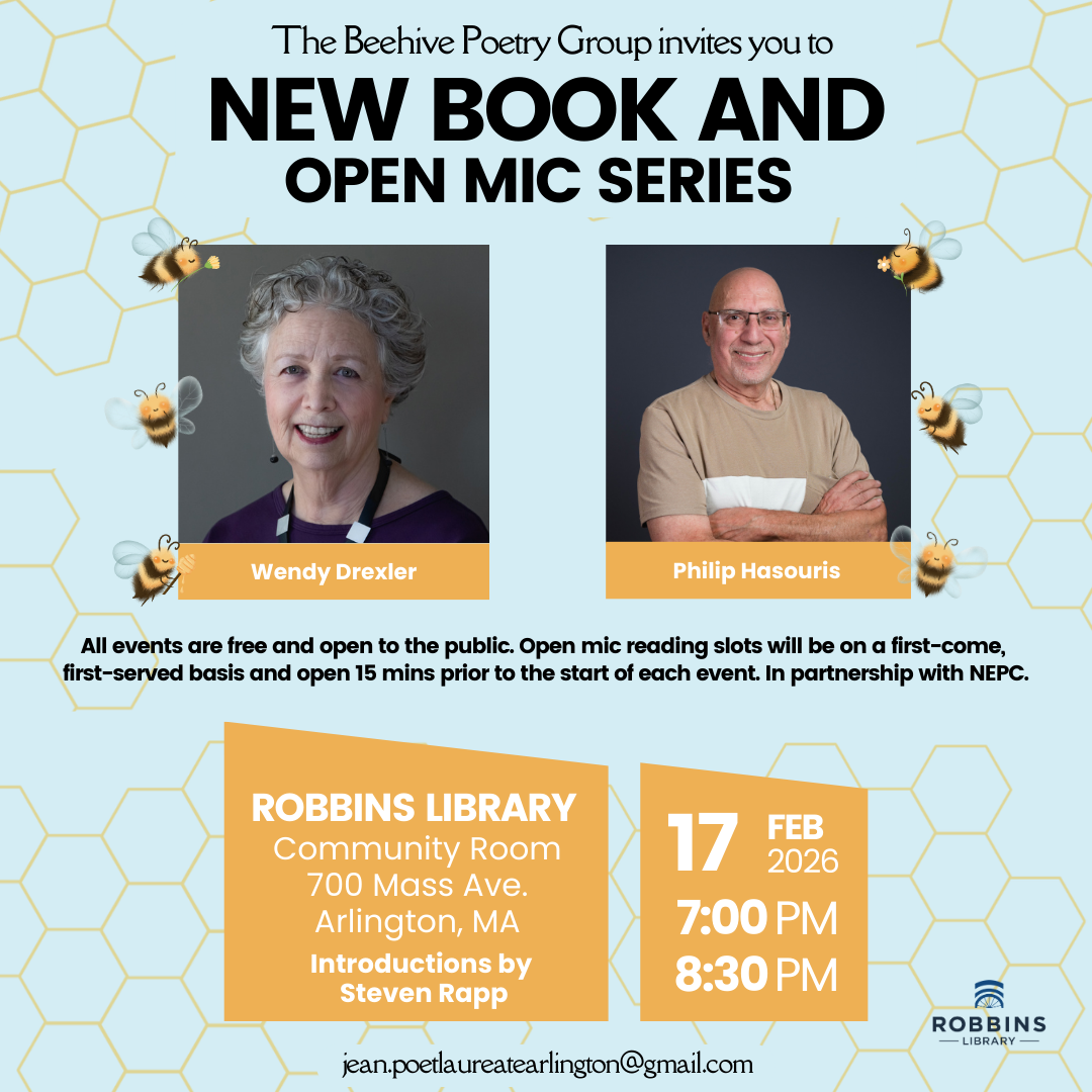 The NEPC continues our partnership with the Beehive Poetry Group, in a reading presented by Jean Flanagan, the Arlington, Massachusetts Poet Laureate. This month’s reading features Wendy Drexler and Philip Hasouris, with introductions by Steve Rapp.